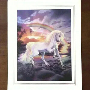 Lovely Unicorn and Rainbow vintage Dufex foil art print.