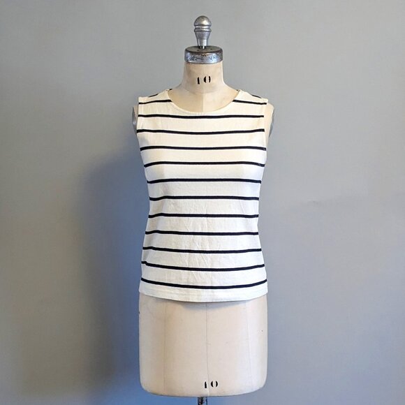 Style: crew neck, breton style, sleeveless, medium weight knit cotton fabric, off white with very dark navy blue thin strips