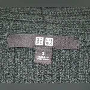 This Uniqlo green cardigan sweater boasts a luxurious ribbed knit texture and a relaxed, oversized fit. Perfect for layering, its long design adds a chic and versatile touch to any outfit.