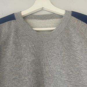 Grey soft crewneck with dark blue stripe down the sleeves.