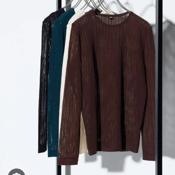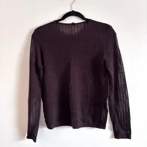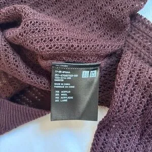 A lightweight jumper from Uniqlo featuring a wool blend (not itchy) material in a lace crochet knit. Dark brown, almost burgundy. Unlined. Fits true to size.