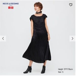 Uniqlo Ines de la Fressange black satin twist pleated short sleeve dress NWT