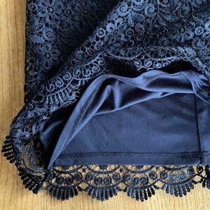 Japanese high fashion for work as well as evening wear, and similar to current Babaton fashion at Aritzia! Uniqlo high quality navy blue lace fabric over soft navy lining, with scalloped hem and concealed zipper at back. Looks great as is, or emphasize the transparency of the lace by shortening the lining's hem. Excellent condition, like new. Japanese size M which fits small but the fitted skirt has some ‘stretch/give’ for ease of movement and comfort.