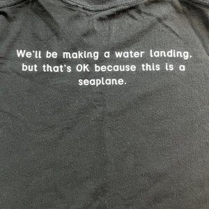 Back of shirt reads "We'll be making a water landing, but that's OK because this is a seaplane."