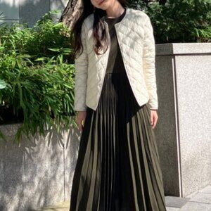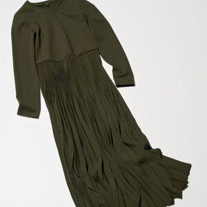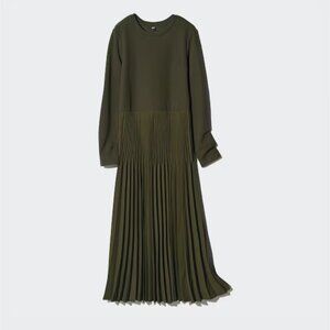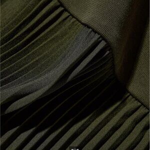 - Fitted feel at the top. Long, flared silhouette. Tiered pleat design flatters the waist.