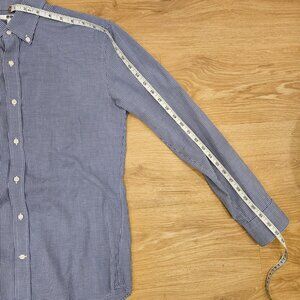 This is a crisp, classic Uniqlo button-down shirt featuring a sharp blue and white gingham pattern. This shirt is a Size Small and comes in the tailored Slim Fit, offering a modern, clean silhouette perfect for the office or a neat casual look. Made from a comfortable, easy-to-wear fabric (material details shown in photos), this shirt is an essential pattern for any wardrobe. All exact measurements and material composition are shown in the listing photos, so please review them before purchasing. It comes from a clean, smoke-free, pet-free home. Grab this versatile shirt today!