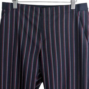 These are navy blue slim trousers with red and light blue stripes by Uniqlo.