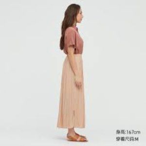 Lightweight, wide leg, elastic waist, pleated pants that look like a skirt. Flowy, breezy and comfortable! Easy to wash and quick to dry. Wear them over leggings in winter, and you can wear them all 4 seasons. There are also pockets on each side.