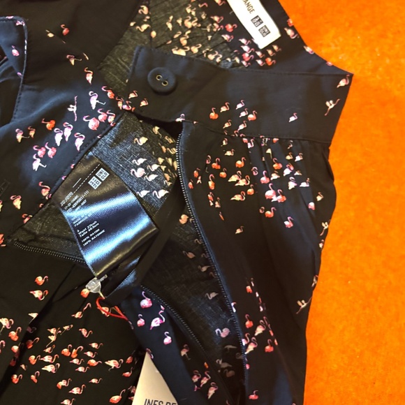 Uniqlo black and pink flamingos skirt and blouse coord set new with tags. The set includes an open collar half sleeve button up blouse and a gathered midi skirt with zip fastening, unlined. The shirt is marked size S Small and the skirt size 6, but both fit larger in my opinion, please see measurements. All measurements are approximate and taken with the garment laying flat. Blouse: Pit to pit 20’’ Total length 24’’ front and 27’’ back. Skirt: waist 13.5’’ Total length 34’’. Both are made of draped 100% rayon fabric and printed with tiny super cute pink flamingos. Very cool and unique. This set comes from an Uniqlo collaboration with Ines de la Ines de la Fressange, synonymous with the timeless appeal of French chic. It was a limited edition and it’s long gone and hard to find. Colour is accurate in the stock photos, mine are taken in artificial light. It’s a little wrinkled from storage and I don’t have an iron or steamer, sorry about that. This item comes from a smoke free, pets friendly home. Recycled bags/box used when possible. Please, let me know if you'd like any additional info. Thanks for watching!
