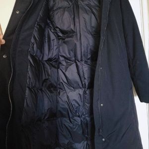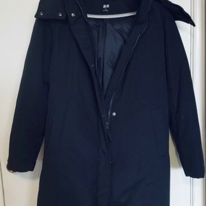 Ultra warm hybrid down long coat from Uniqlo, size XS, color navy. Sleek, elegant, and stylish non quilted design for a clean look. It has puffer inside which makes it warm in colder temperatures. Can be used daily or for special occasions. Warm and insulating.
