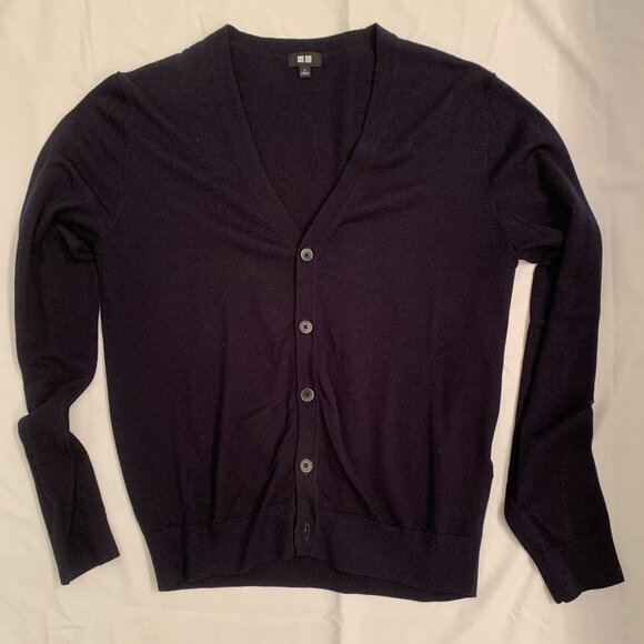 This is a soft and luxurious navy 100% wool cardigan. It is in excellent condition with little to no signs of wear. Measurements: pit to pit: 50.8 cm/20 inches shoulder length: 43.2 cm/17 inches height: 63.5 cm/25 inches