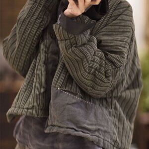 Very cute, rare to find design, pure linen-cotton Autumn/Winter wear, Quilted (padded), Loose Warm Striped Jacket.