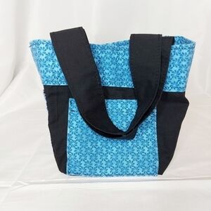 This handcrafted reversible handbag features striking blue and black hues, with a unique skull pocket design, making it both stylish and versatile.