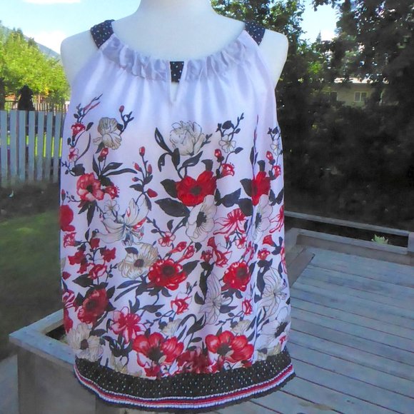 Cleo Petites, Unique Vibrant print Blouson top. Sleeveless, gathers at waist, unique neckline. Colours - white/navy/red Size L Petite, Silky fabric, 100% Polyester. Hardly worn - like new