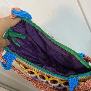 This vibrant crochet bag features a stunning array of colors, perfect for adding a pop of color to any outfit. Its unique design and multicolor pattern make it a standout accessory.