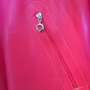 Gorgeous A line, dolman sleeve, leatherette coat, zip up collar, two zip up front pockets. This designer piece is so very soft to the touch...leatherette. The color is outstanding! bintage, in excellent condition, never worn. Very light small mark on inside of collar. Lenght of coat is 40".