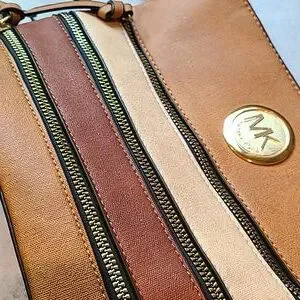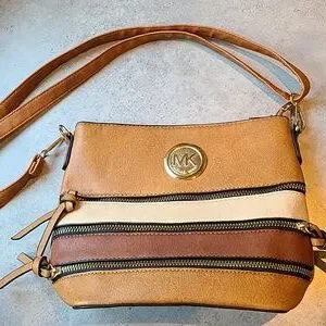 Says Michael Kors but I'm not sure it's genuine? It's in very good condition, looks brand new . 3 shades of brown, on of the zippers on the front opens into a pocket