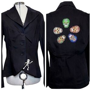 This handcrafted fitted black denim jacket features vibrant sugar skull embellishments and a dancing skeleton motif. It is a unique piece using a repurposed jacket