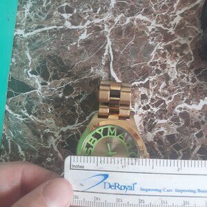 Gold with a see through glass, 6" wrist size, needs battery no box or extra links.