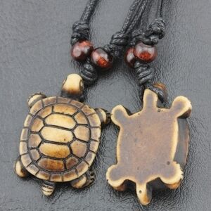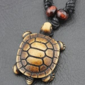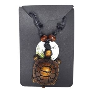 This handcrafted unisex necklace features a resin turtle totem with wood beads on an 18-inch cotton wax cord, ideal for meditation and relaxation.