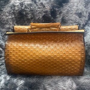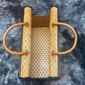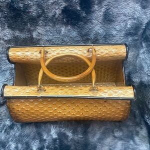 This is a very interesting piece. It can be used to hold blankets, magazines etc but a good conversation piece as it looks like a large purse/bag. Some missing paint spots see photos but in very good condition.