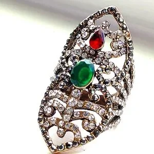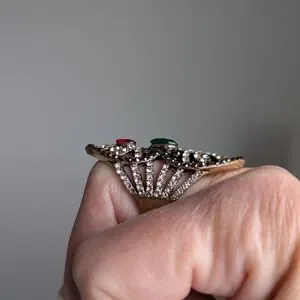 This exquisite ring features vibrant green and red stones set in a stunning silver design. Perfect for adding a touch of elegance to any outfit.