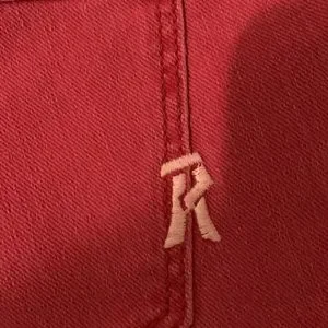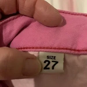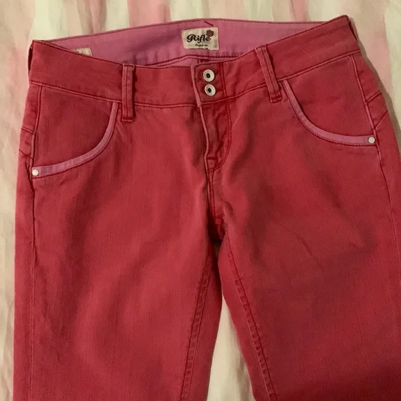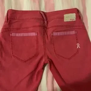 Jeans are a soft red with pink trim on the pocket top edges. Straight leg fit. Super soft fabric