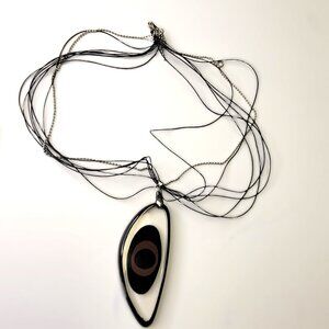 A bold pendant, with 6 sleek black cords, and a silvertone ball link chain link.
