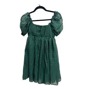 This charming babydoll dress is crafted in a lightweight emerald green plaid chiffon over a matching emerald lining
