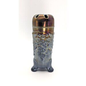 The deep, mesmerizing gold, amethyst and blue hues of this vintage Northwood Grape and Cable hatpin vase immediately captivates the eye. Its carnival glass origins lend a subtle iridescence that dances across its surface, a testament to the unique firing techniques that create such stunning effects. The signature Northwood mold, with its intricate grape and cable relief pattern, adds a layer of tactile richness, inviting the fingers to trace the delicate vines and plump fruit.