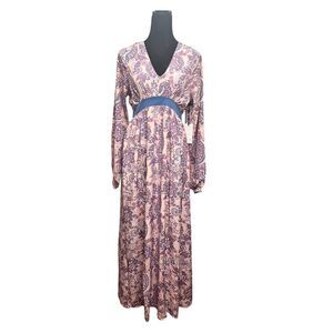 A heart-stopping maxi dress, crafted in a lightweight woven fabric that boasts a beautiful paisley print of dusty blue, pink, and white cascading throughout the light pink backdrop