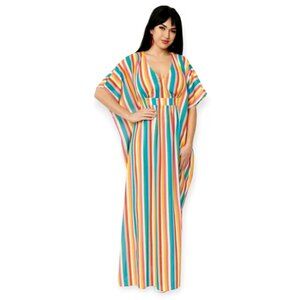 This vibrant caftan dress by Burton features rainbow stripes on lightweight polyester with a V-neck and self-tie waist for ultimate comfort and style.