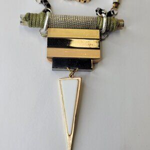 The pendant has few diferent hues with a green corded thread accents and black white and gold tones