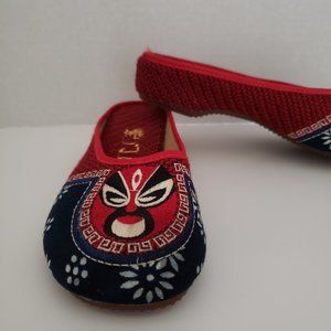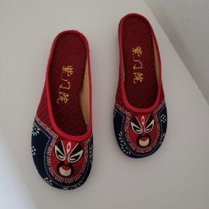 Unique, comfy Asian weaved mule shoe slipper. Kabuki style embroidery