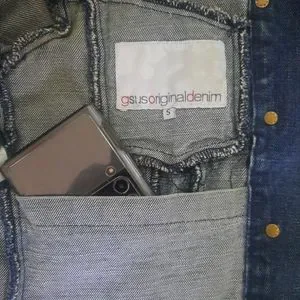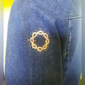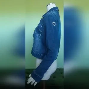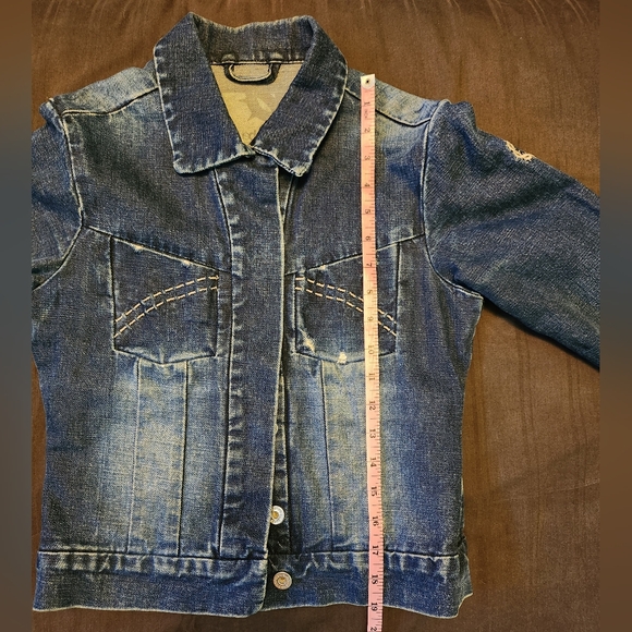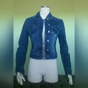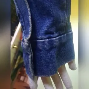 I've had this beauty for over 30 yrs. Made so proper. Even has a denim hook for easy hang. This piece is a gem. 2 front pockets w. 2 deep inside pockets as well. Unique dirty wash w. dashes of distressed fray on front pocket. Hidden snaps when buttoned up. Form fitting. Amazing condition.