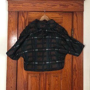 Really unique designer jacket. Black and brown plaid with silver and pink highlights. Collar is in two layers, each with adjustable pulls so you can ruche and style it as you wish. Single button. Cropped. Canadian designer/made in Canada.