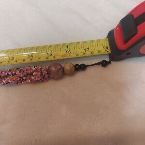 Amazingly gorgeous vintage statement necklace. Well made beaded with exquisite intertwined shades of pink orange black and white beads typed with gorgeous wooden beads. Stunning! One of kind and sure to turn heads.