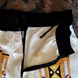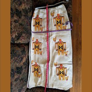 Unique, felted wool, cream, long skirt, with geometric, Aztec-style embroidery, gold, red and black, and mirrors, black velvet trim made for a theatre performance. (Skirt or craft project.) Hand made costume, hand crafted, size women's L. Width inches half measurement = waist 14.5, hips 21, length inches 42.
