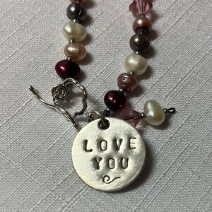 Unique handmade Pearl Necklace with stamped Love You Pendant