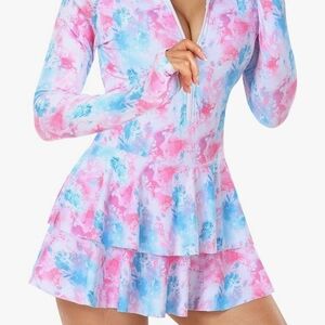 Uniquebella women's size XL swimsuit rashguard, bra inserts, 1/2 Zip tags removed, not worn, pink, blue & white water color design, boy short bottom, skirted, long sleeve