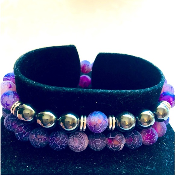Unisex 2 Amethyst Purple Stretch Bracelets with Hematite beads
