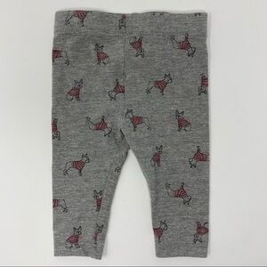 Two leggings with knit texture in light and dark grey. One pair of leggings with dog print.