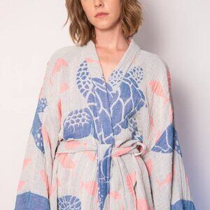 Wrap yourself in coastal charm with this stunning 100% Cotton Turtle Print Robe, beautifully crafted in Turkey. Featuring an intricate sea turtle and fish motif in calming shades of ocean blue and coral pink on a soft grey background, this robe brings a serene seaside vibe to your wardrobe. The breathable cotton fabric is lightweight yet cozy, perfect for year-round wear.