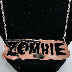 Length of silver tone chain is 10" on each side of Zombie word. Zombie word is 2.75" long and just under 1" tall. Preowned and gently used.