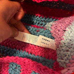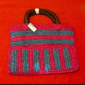 United Colors of Benetton large straw tote new with tags. Large braided straw bag made of paper, polyester bottom, grab or shoulder handles, pink and turquoise stripes on front and back, and purple and yellow on sides. Height:13.5" (34 cm), length 17.25" (44 cm), width: 7" (18 cm). Shell 100% paper, interior 90% paper and 10% poly. This item comes from a smoke free, pets friendly home. Recycled bags/box used when possible. Please, let me know if you'd like any additional info. Thanks for looking!