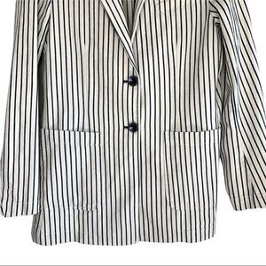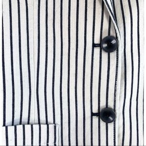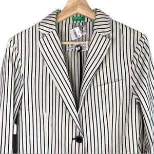 This is a United Colours of Benetton 100% Cotton Oversized Striped Blazer Size US 2/ 38 Pit to Pit 18” Shoulder to Hem 29” •. Black and Cream Colours • 100% Cotton • Slits on Cuffs and at Back • Pockets ^SO19
