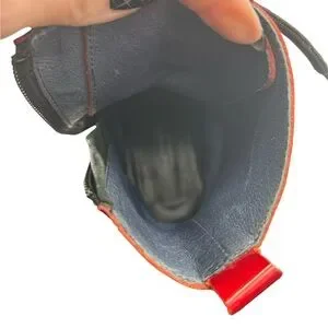 Step out in style with these striking red combat boots. Premium Leather Upper and Lining. Textured Rubber Sole. 1” heel. Boot is Size 39 (roughly size 8 US). Pre-loved, there is some damage to the tongue of each boot ( as pictured) but it’s not noticeable while wearing. Good condition, some very minor marks.