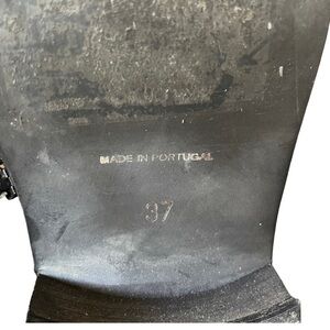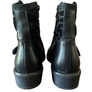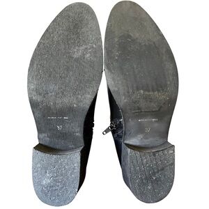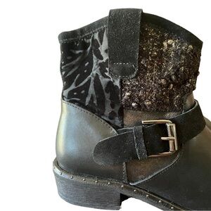 Sleek black leather with textured metallic accents. Bold buckle detail with a zipper up the sides. Perfect for versatile styling. These boots have beautiful nail detail around the sole and are in excellent condition.