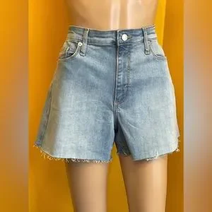 High rise midi denim shorts. Fitted hip and leg