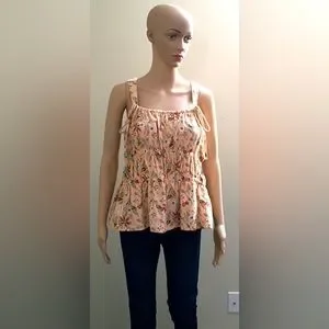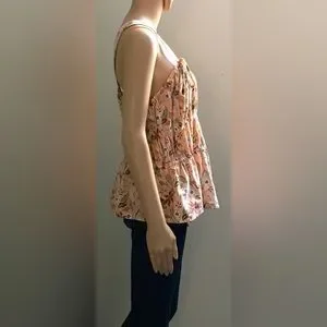 Peach Tank Top with Floral Pattern. Tie Detail at Shoulders. Elastic at Neckline, Arm Openings and on Bodice